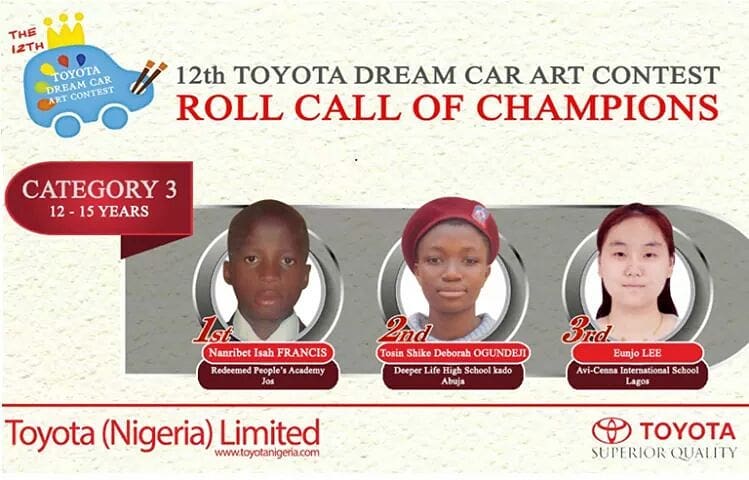 Join us as we celebrate the Champions of the Toyota Dream Car Art Contest (Under 8 Category) Congrats to Lana Racheal JABER (Greater Scholars International School, Lagos), Erela Naomi OJU (Chokhmah International Academy, PH) & Emmanuel Damilare SANNI (Shepherd Field Private School, Lagos).